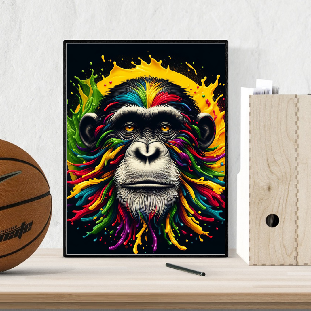 Unleash the wild energy of creativity with “Primal Spectrum”, a high-quality canvas print that fuses nature with bold artistic expression. This mesmerizing artwork features a majestic chimpanzee adorned with an explosion of vibrant, flowing colors, symbolizing intelligence, curiosity, and the untamed spirit of life. A perfect statement piece for modern interiors, creative spaces, and those who embrace the power of color and imagination.