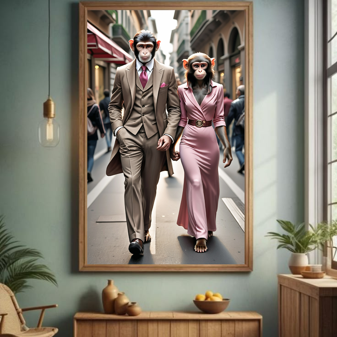 Step into a world of style and confidence with “The Elite Stroll,” a striking high-quality canvas print that redefines sophistication. Featuring a dapper primate power couple exuding charm and elegance as they walk through a bustling city, this artwork is a bold statement of grace, unity, and success. Perfect for modern interiors, luxury spaces, and those who appreciate a blend of humor, artistry, and high fashion.