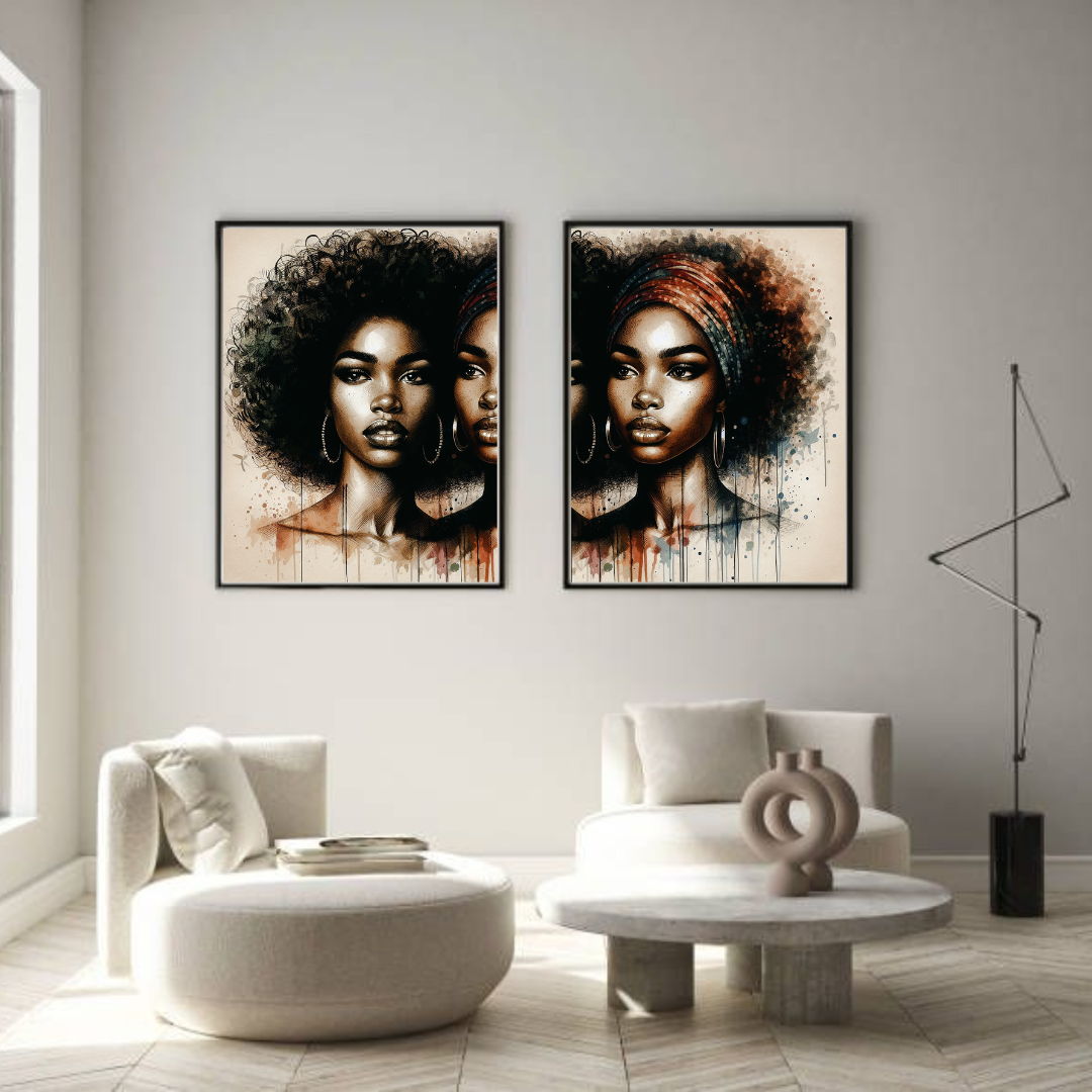 “Triple Sisterhood Mystery” is a breathtaking high-quality canvas print that captures the essence of resilience, beauty, and unity. Featuring two powerful women with striking expressions, this piece blends contemporary portraiture with artistic brushwork to create a bold yet elegant statement. Perfect for modern interiors, this artwork celebrates heritage, confidence, and the unbreakable bond of sisterhood. A stunning addition to any space that values culture and empowerment.